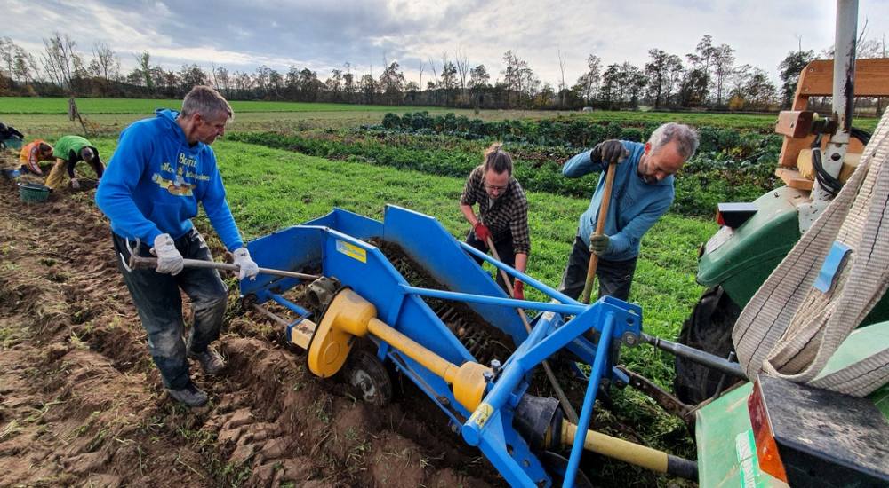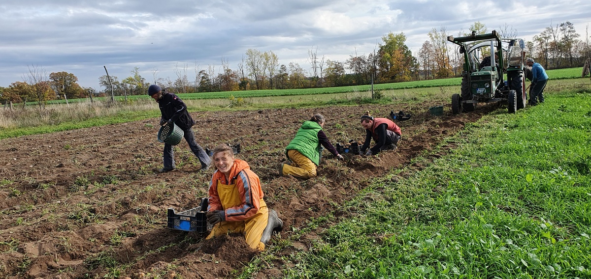 Alle Jahre wieder braucht es kräftigen Gemeinschaftseinsatz für die Kartoffelernte auf den vom ZEGG von der Nachbargemeinschaft 'LebensGut Lübnitz' gepachteten Ackerflächen. Sieben Tonnen wurden in diesem Herbst geerntet - eine gute Ernte, die den Jahresverbrauch von ZEGG-Bewohnern und Gästen ungefähr abdeckt.